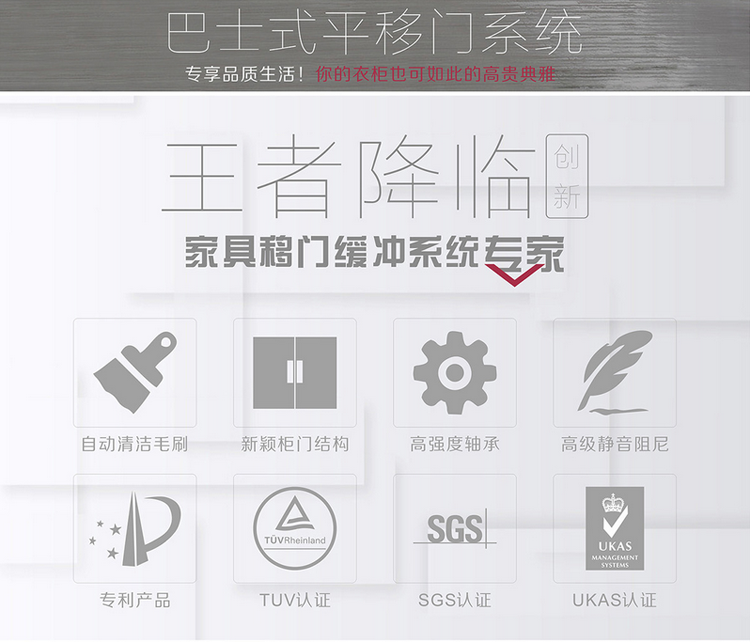 衣柜巴士門是一種創新的開門方式,它突破了門扇關閉時錯位的傳統方式,能實現平滑的自動開閉,且柜門關閉時兩扇門處于同一平面,視感上更為舒適、簡潔。