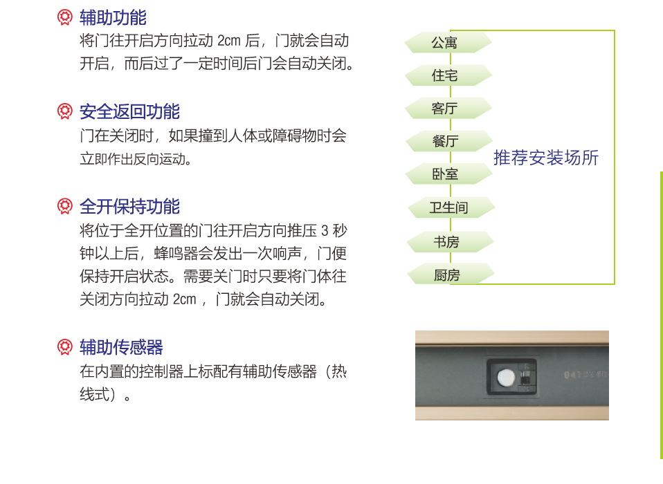 小型磁懸浮自動(dòng)門符合家用自動(dòng)門及殘障門標(biāo)準(zhǔn),此標(biāo)準(zhǔn)是普通商業(yè)自動(dòng)門機(jī)無法達(dá)到的。安全、靜音、斷電操作、